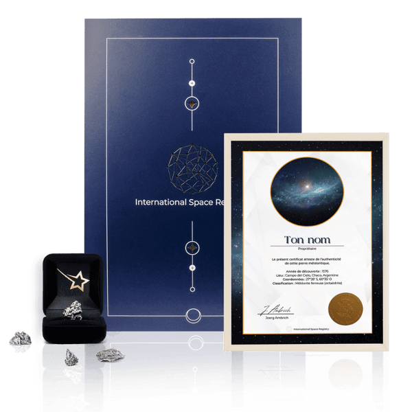 Oui. Tu peux ajouter directement le nom de la personne à qui tu veux offrir la météorite dans le configurateur avant l’achat. Si tu préfères, tu peux aussi laisser le champ vide et écrire le nom à la main plus tard. Le certificat est imprimé sur du papier haut de gamme, décoré avec des finissions dorées et le sceau officiel de l’International Space Registry.